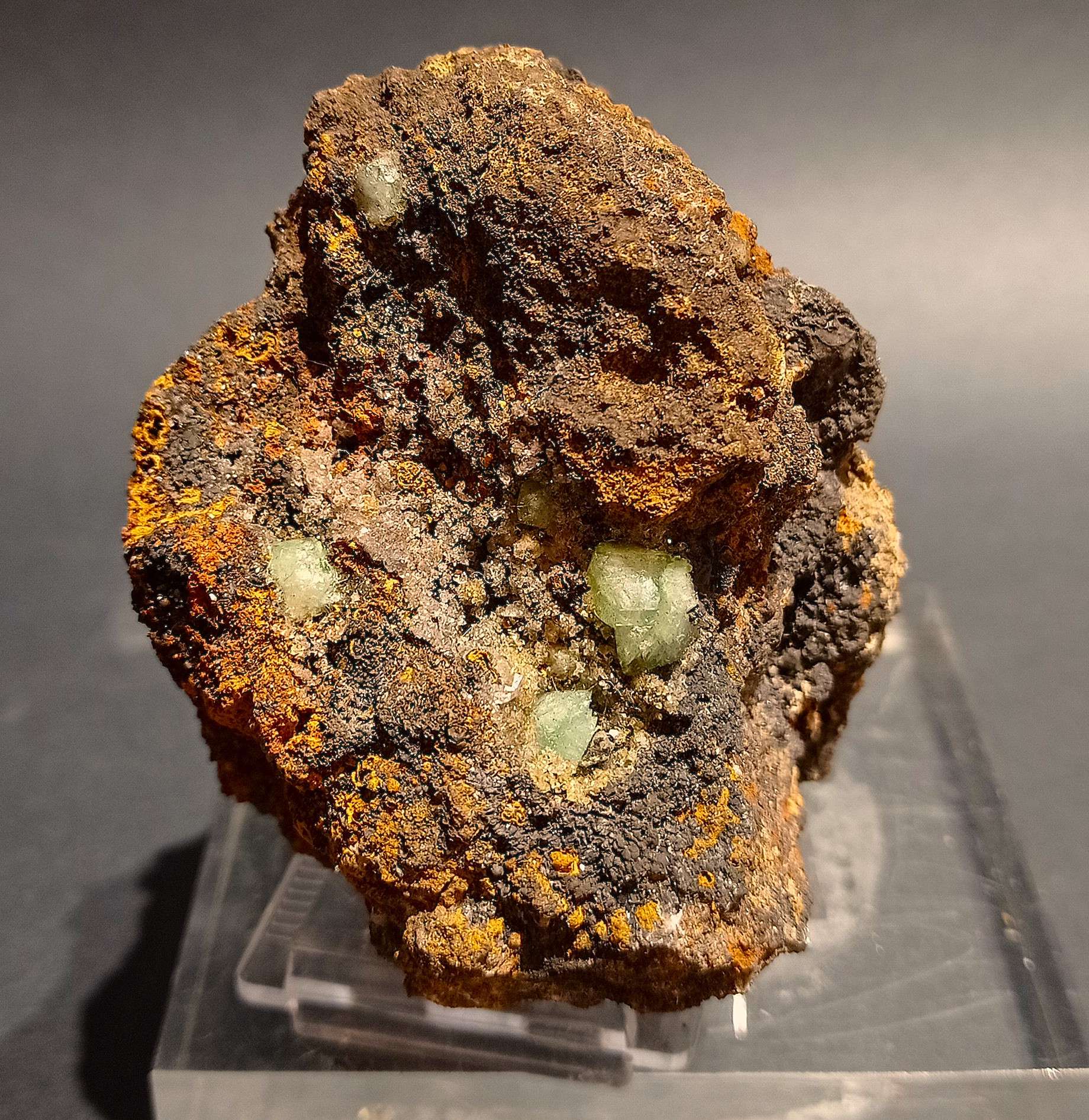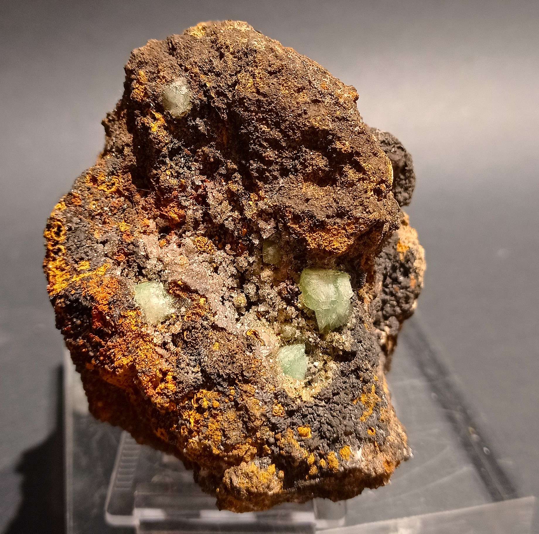 DIMENSIONE SINGOLI CRISTALLI: piccoli cristalli di adamite verde bottiglia, con presenza di giallo, anche la parte posteriore è parzialmente cristallizzata.