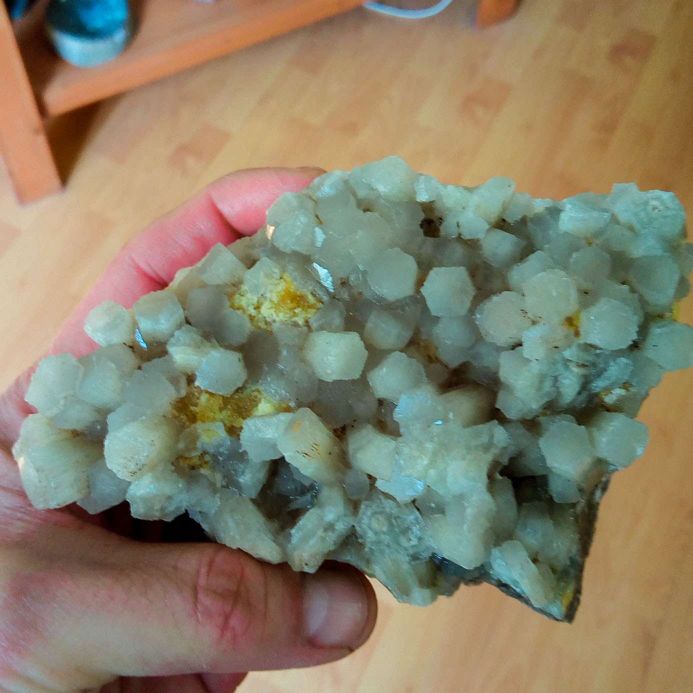 DIMENSIONE SINGOLI CRISTALLI: cristalli di dimensione media da un diametro di 10mm e lunghezza media 15mm, di un colore verde-azzurro intenso, con presenza di zolfo colore arancio.