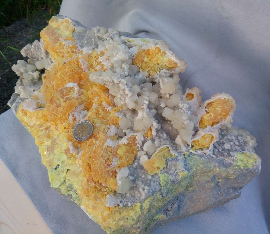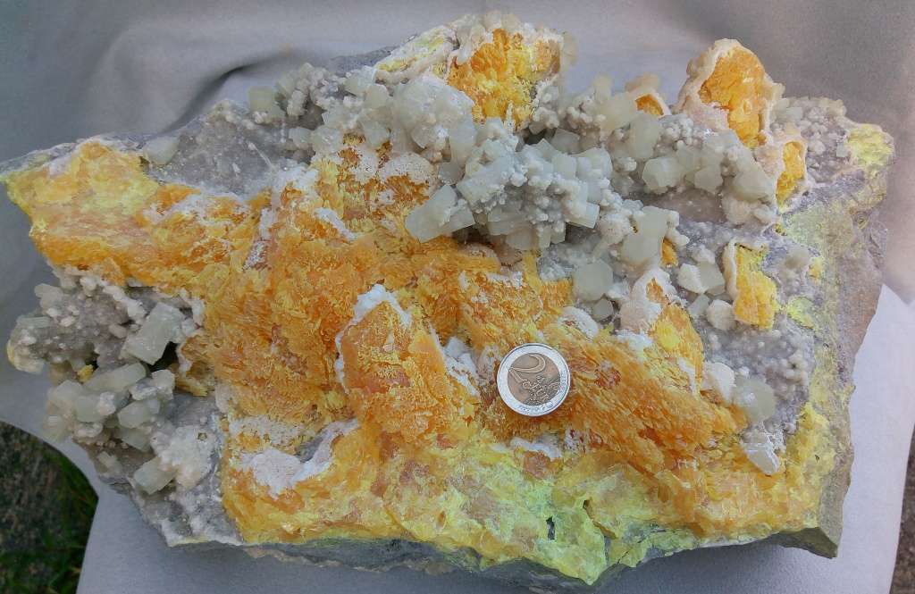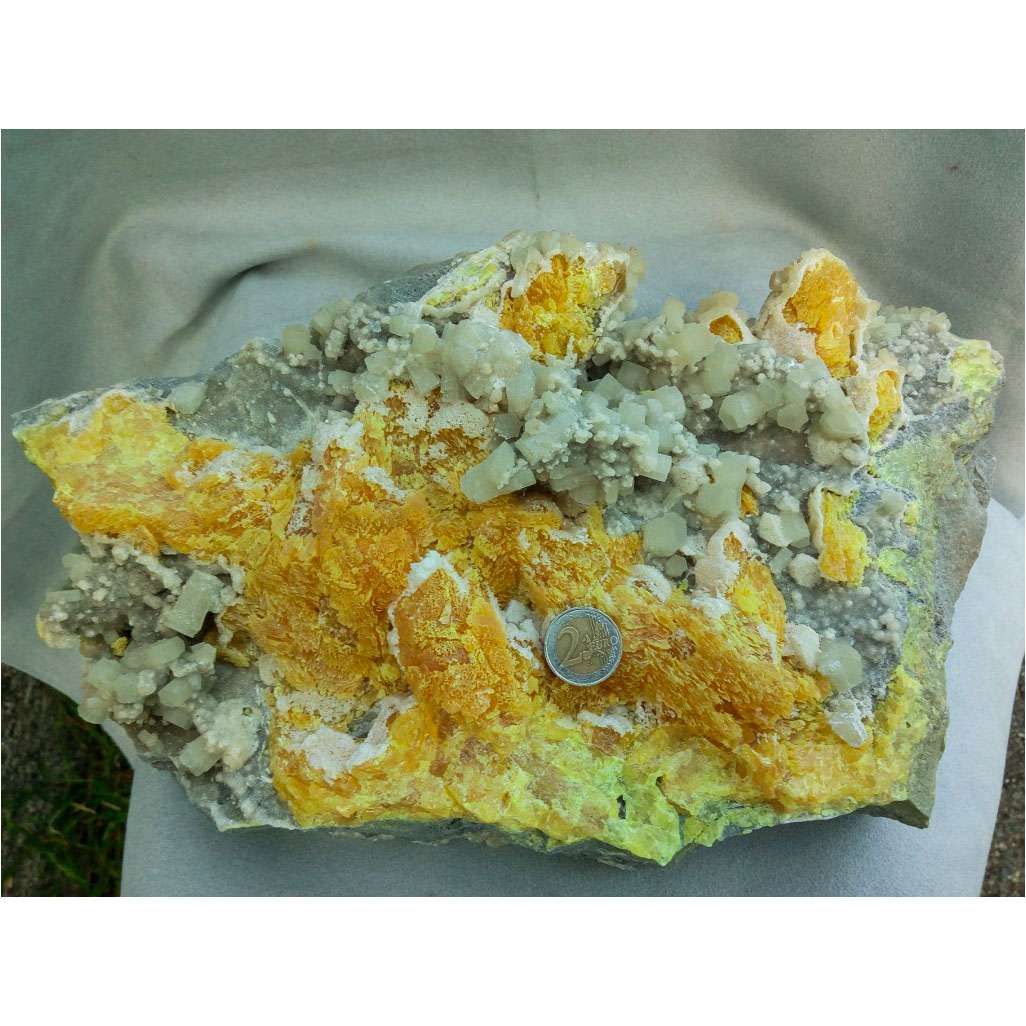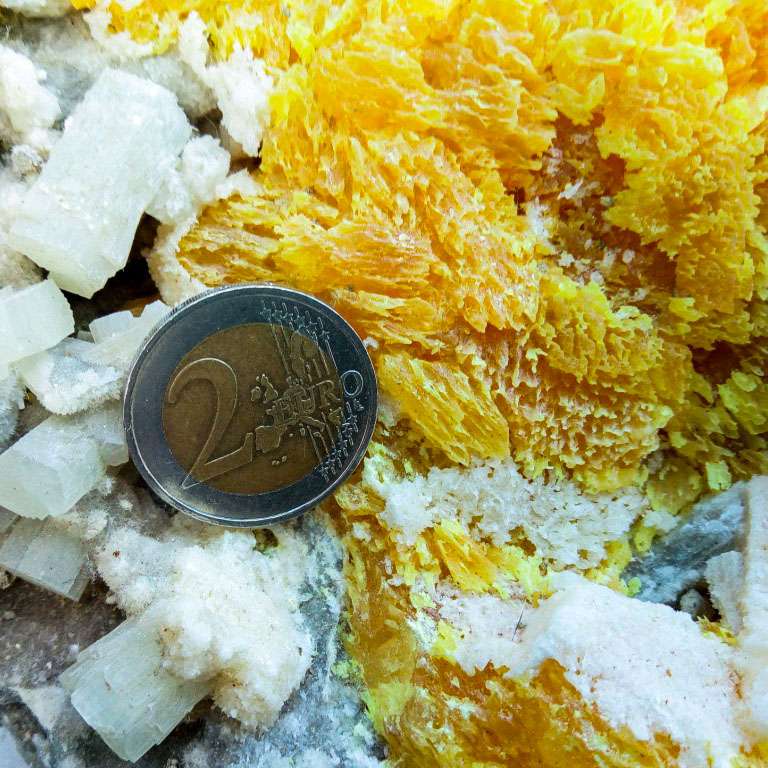 DIMENSIONE SINGOLI CRISTALLI: cristalli di dimensione vanno da un diametro di 16mm a 10mm lunghezza media 25mm, lo zolfo si presenta fibroso e di un bel colore giallo arancio con sfumature di rosso
