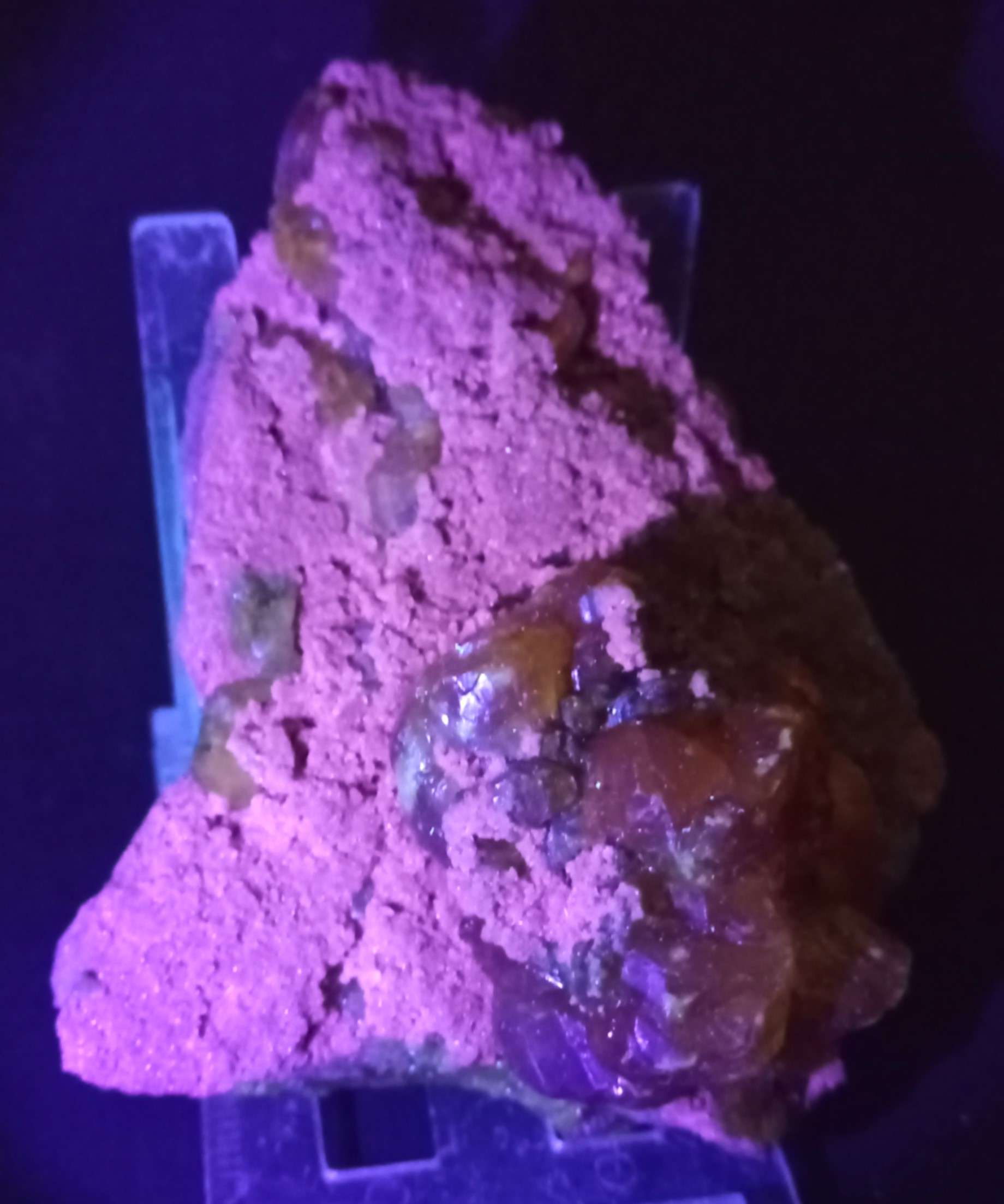 La caratteristica principale di questo minerale è la spiccata fluorescenza, il minerale esposto alla lampada di wood produce un eccezionale fluorescenza rosso arancio.