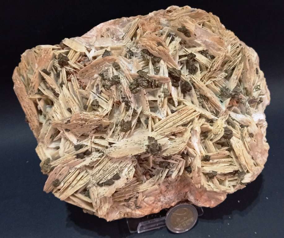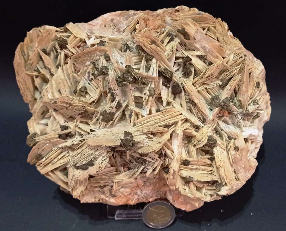 DIMENSIONE SINGOLI CRISTALLI: cristalli tabulari che si incrociano che vanno da 6 a 3cm, presenza di aggregati di calcopirite.