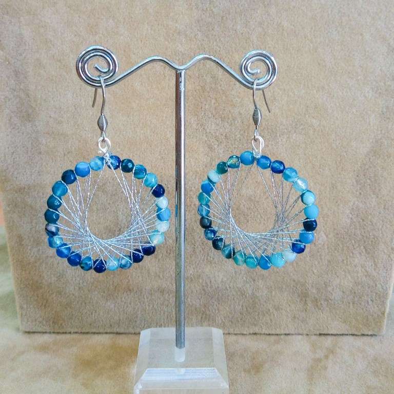 DIMENSIONE E FORMA GEMMA: diametro orecchini 35*35mm con numerose sfere di agata blu da 4mm.