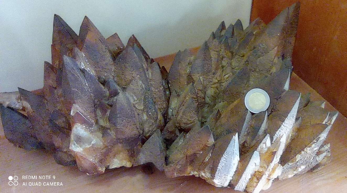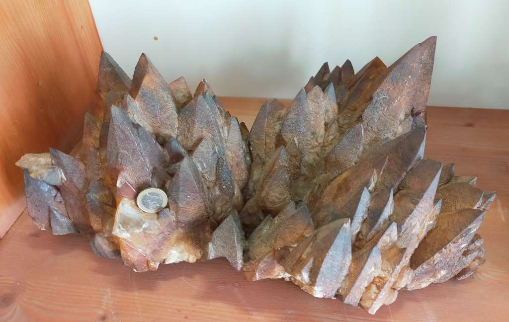 La calcite è un carbonato di calcio di colore bianco, giallo e arancio, si presenta sotto forma di cristalli scalenoedrici a forma di dente di cane, e si forma all’interno di rocce carbonatiche, cristallizza nel sistema trigonale, ha durezza 4 e peso specifico 2,7.