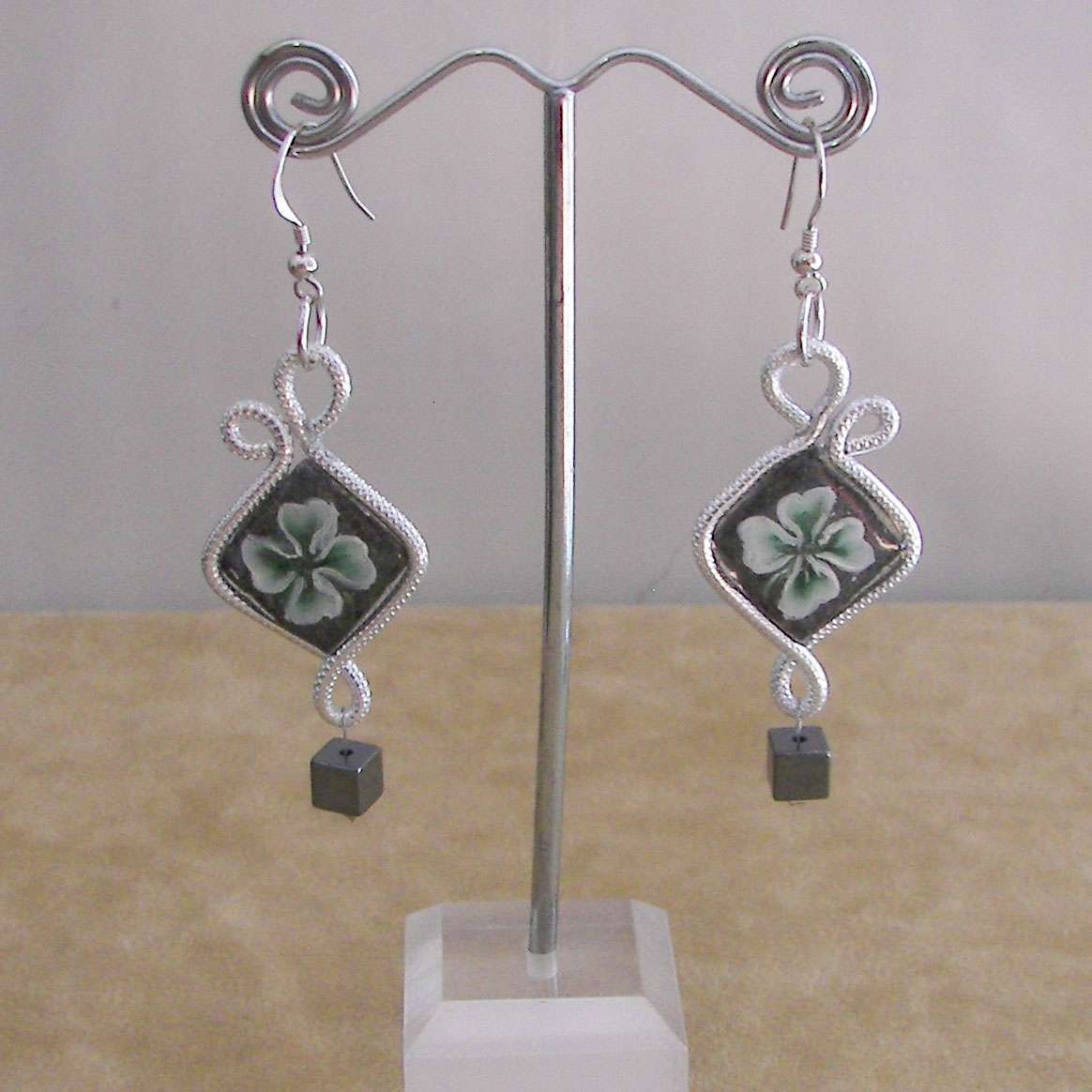 METALLI UTILIZZATI: Montatura leggerissima in alluminio anallergico e inossidabile con cubi di ematite di 5mm lato.