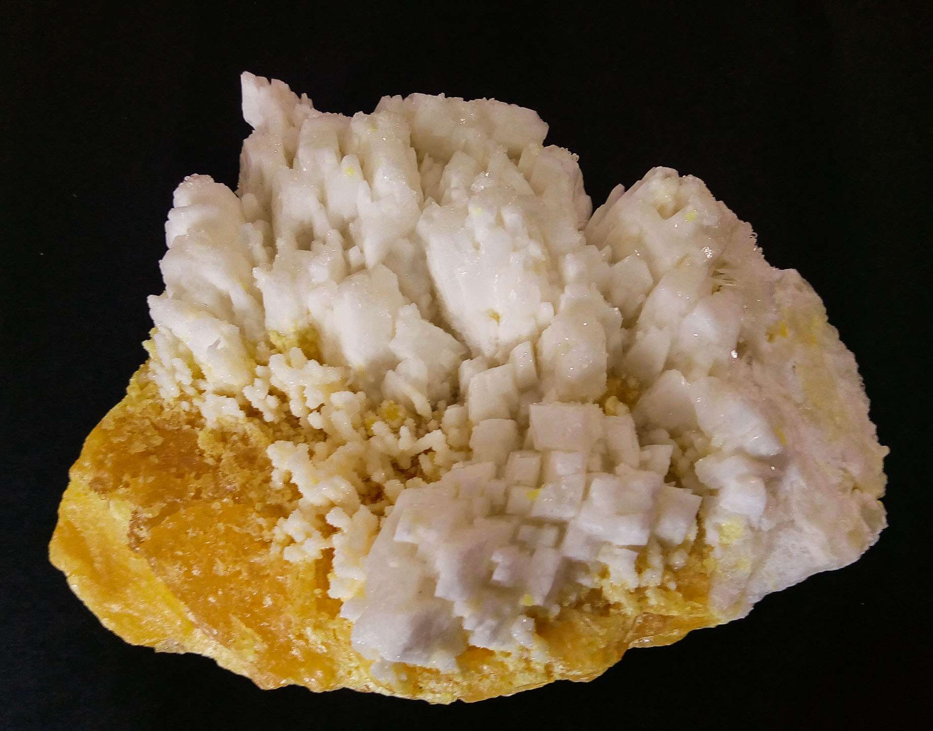 DIMENSIONE SINGOLI CRISTALLI: Rari cristalli di celestina a scalpello con spalmature di zolfo, la parte posteriore e completamente cristallizzata a zolfo.