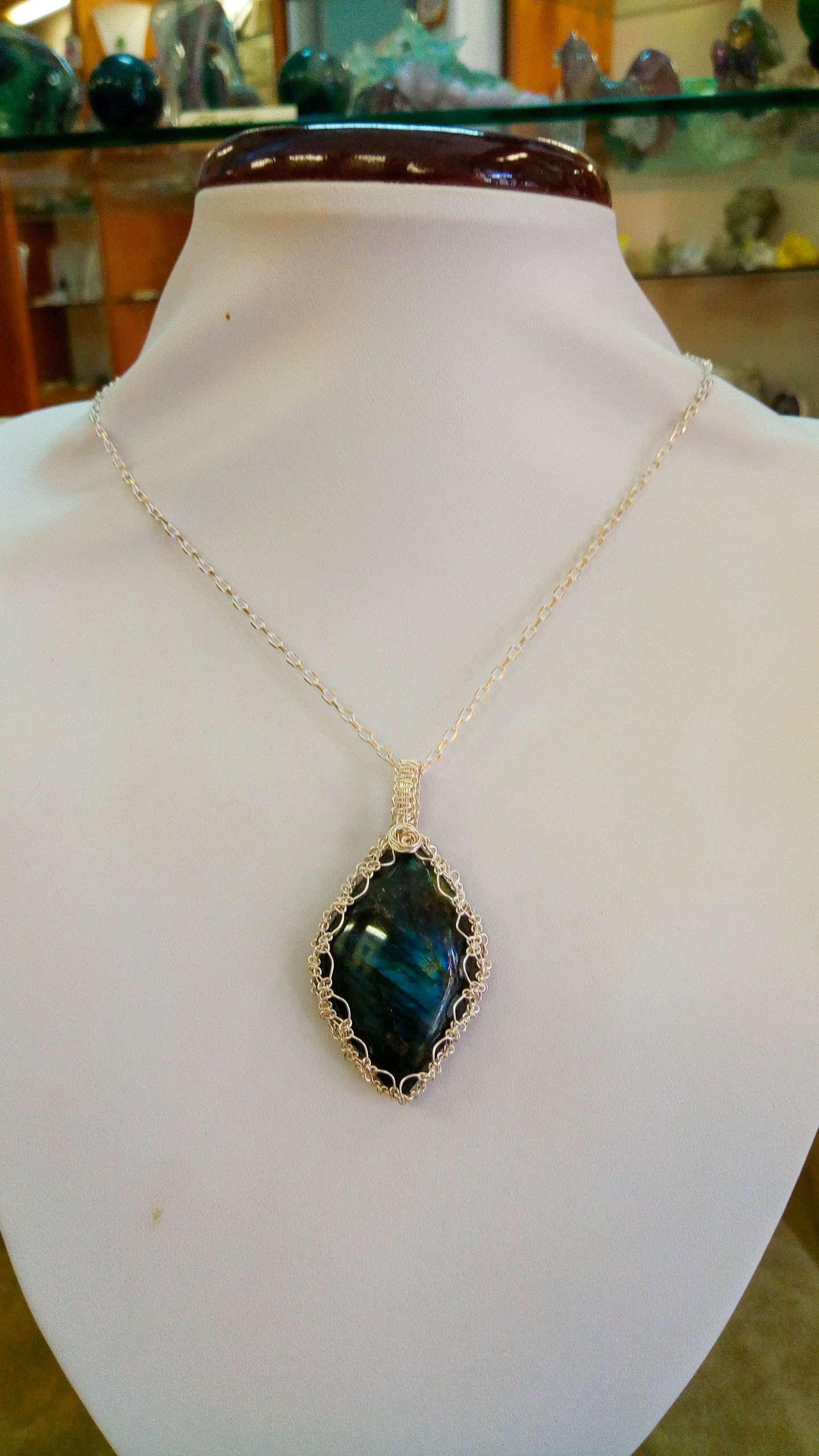 La labradorite è un minerale formato da silicato di sodio ha un colore cangiante che va dal blu la grigio fino al verde in funzione della posizione dell’osservatore rispetto al minerale, questo effetto prende il nome di labradorescenza.
