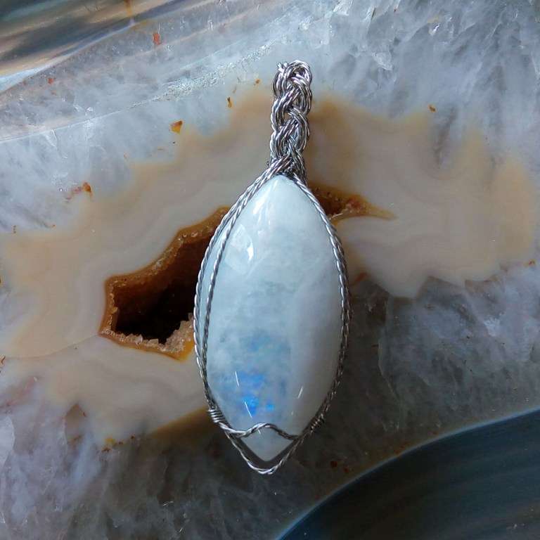 La caratteristica principale della pietra di luna è quella che caratterizza anche l’adularia stessa: l’adularescenza è un fenomeno dovuto alla disposizione in file parallele delle lamelle degli smistamenti pertitici dei feldspati, oltre che eventuali inclusioni; il fatto che i feldspati non siano mescolati tra loro dipende dalla temperatura di formazione della pietra di luna: se è bassa, ognuno dei feldspati cristallizzerà per proprio conto, l’uno dentro l’altro. Area di provenienza Brasile.