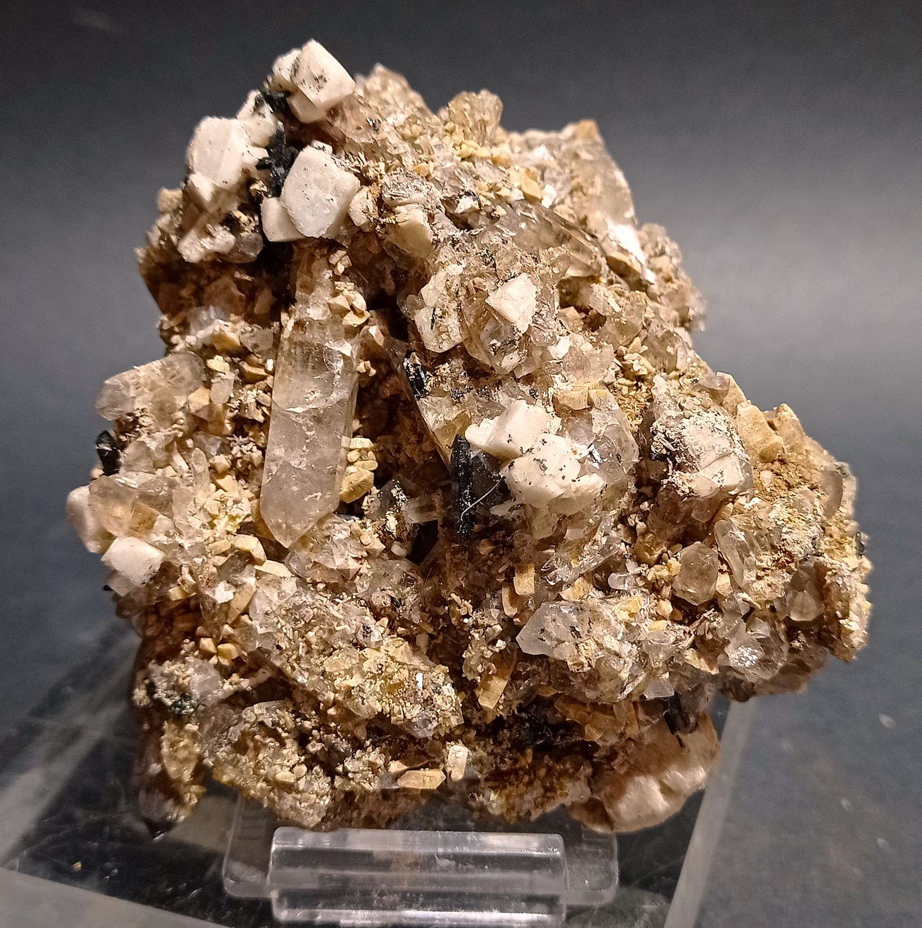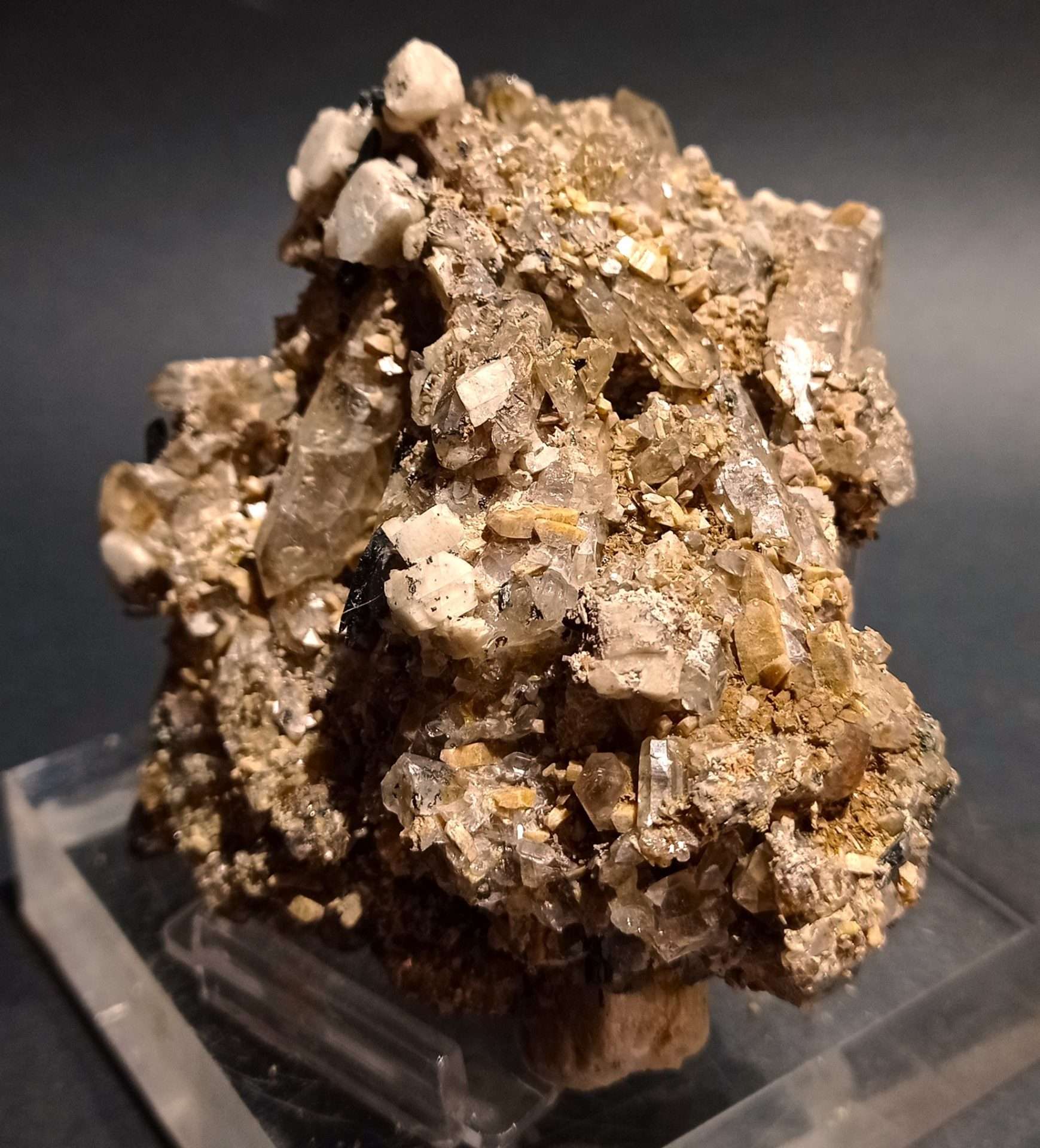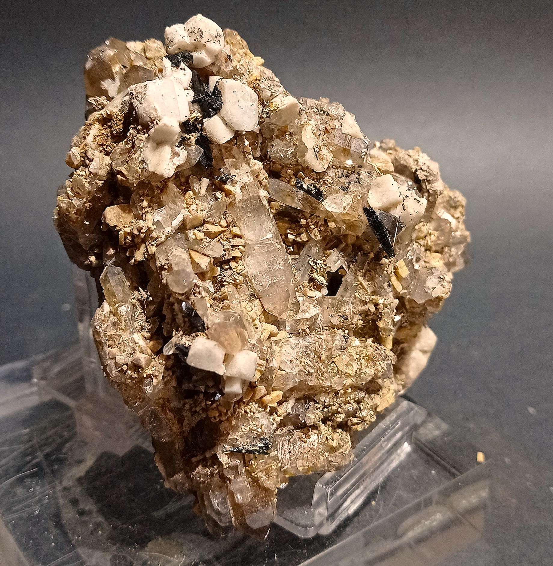 Si tratta di un campione in cui sono presenti più minerali quali: quarzo di un colore quasi sempre fumé, ortoclasio di un colore bianco crema e di aegirina di un colore nero brillante, il campione si è formato in ambiente pegmatitico