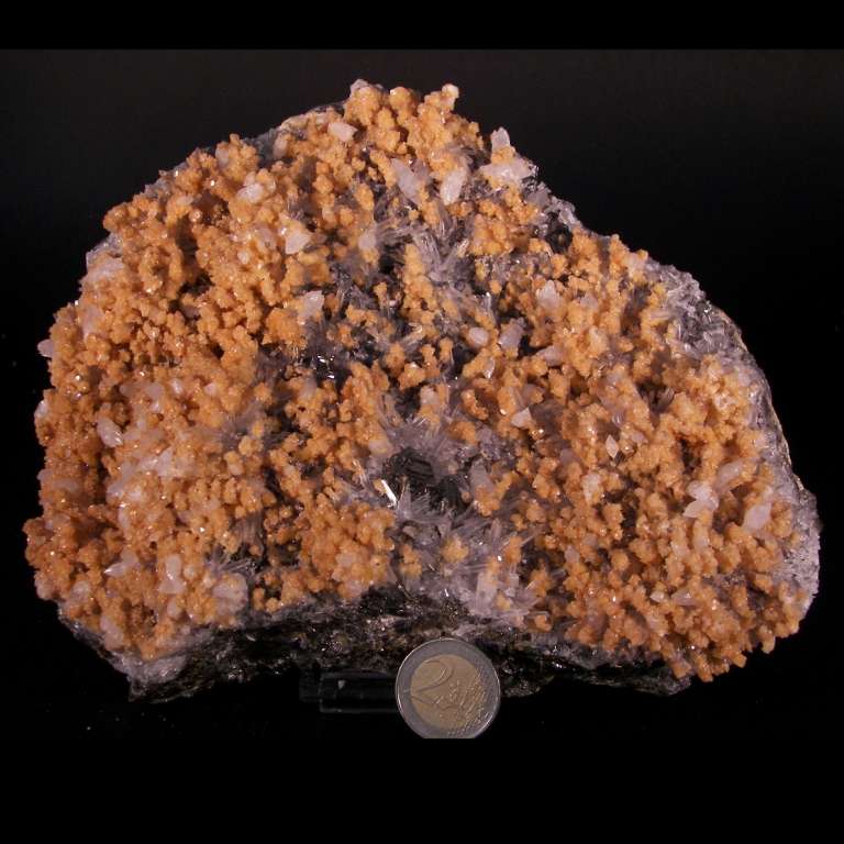 DIMENSIONE SINGOLI CRISTALLI: I cristalli di quarzo hanno dimensione media 2*2mm, altezza 12-15mm, la tetraedrite è 15*15mm, mentre la calcite bianca è biterminata, con dimensione 5*5mm, quella di colore arancio è microcristallina, il pezzo è cristallizzato a galena e calcopirite nella parte posteriore.