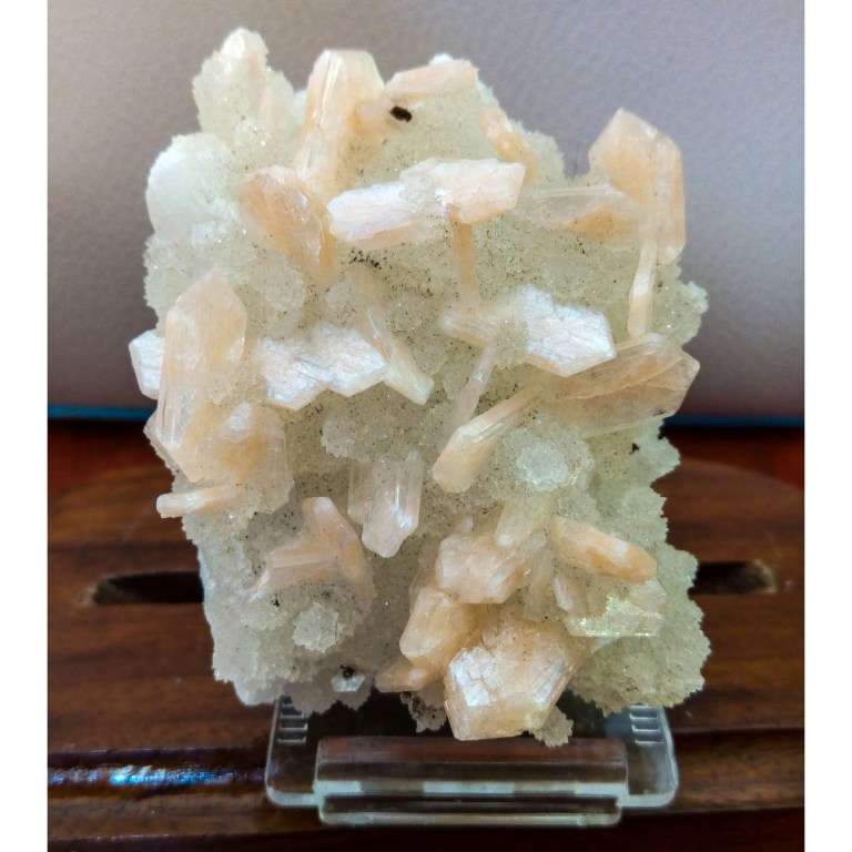 cristalli di stilbite rosa, 15*15mm, incastonati fra più piccoli di prehnite.