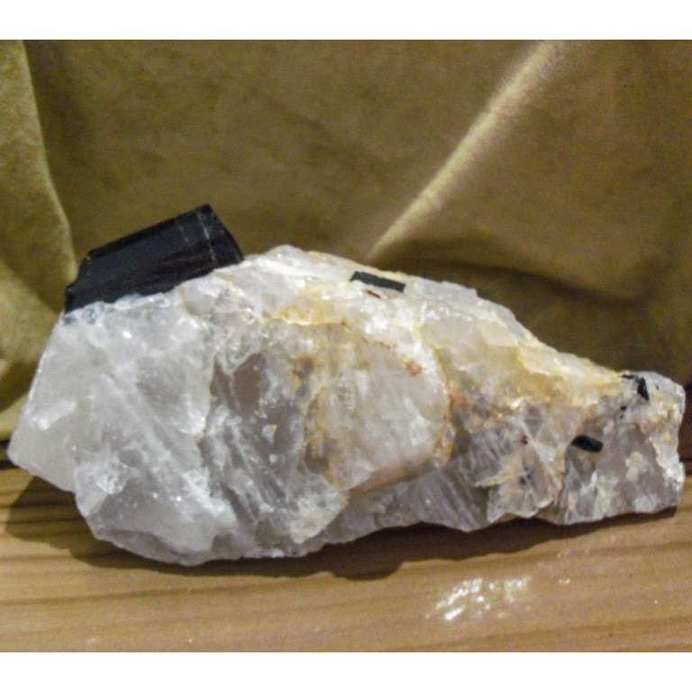 Tormalina su quarzo, è un quarzo di colore bianco trasparente con cristalli di tormalina nera al suo interno e si trova all’interno di rocce plutoniche che sono state riempite dalla deposizione di acque idrotermali ricche di ossido di silicio e altri elementi.