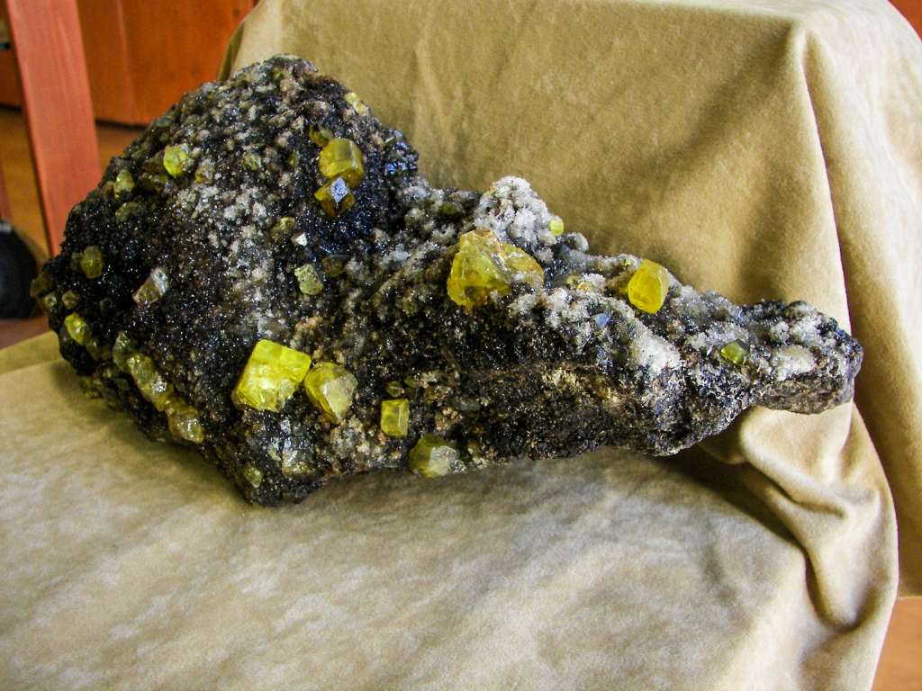 DIMENSIONE SINGOLI CRISTALLI:i cristalli di zolfo poggiano su cristalli aciculari millimetrici di aragonite a sua volta ricoperti da bitume, i cristalli maggiori di zolfo sono 20*20mm, i cristalli minori di zolfo sono 10*10mm i cristalli hanno un altezza media da 12-8mm. Due cristalli sono sbeccati.